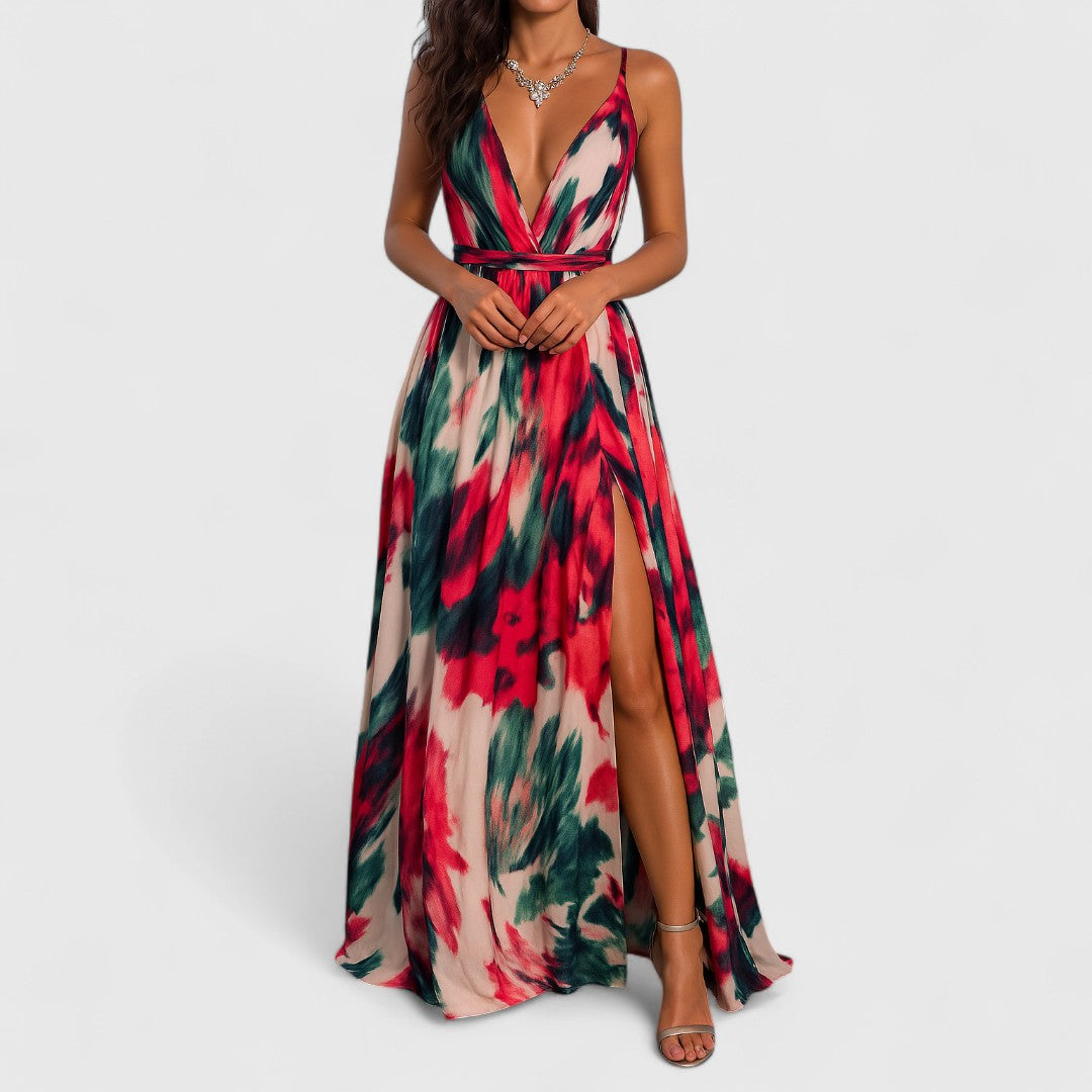Styliane Elegant Floral Maxi Dress With Deep Neckline