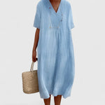 Androniki Cotton Blend Summer Midi Dress With V Neckline is your go-to piece for breathable coolness and effortless elegance on warm Irish days and nights.