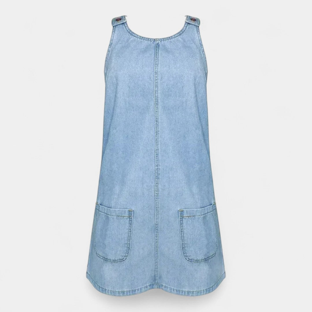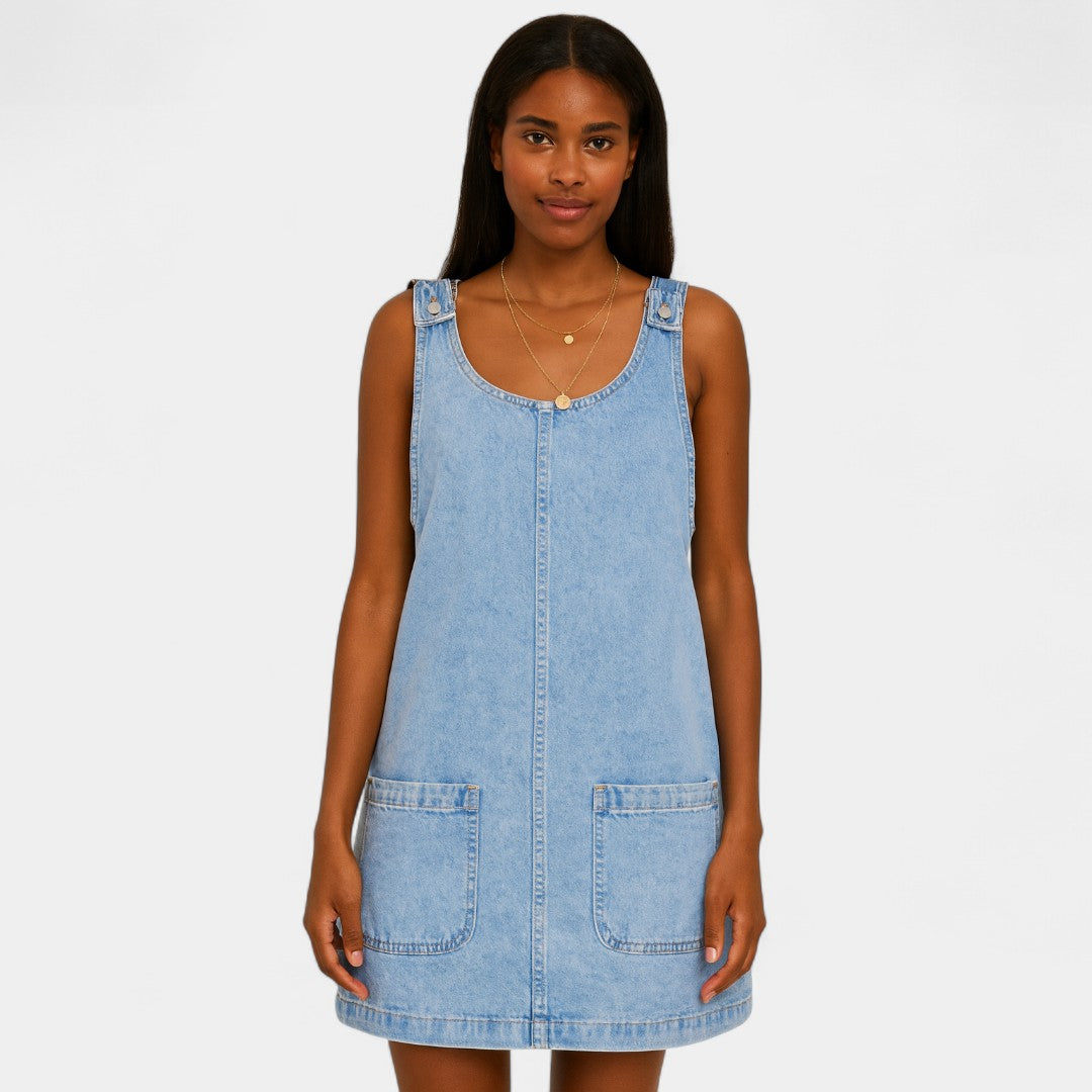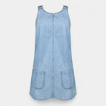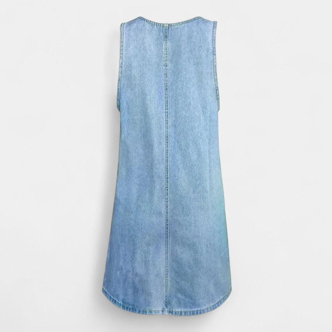 Designed in lightweight denim with a relaxed silhouette, this sleeveless dress keeps you cool while still looking chic, whether you’re on staycation, coastal strolls, or busy days at the market.