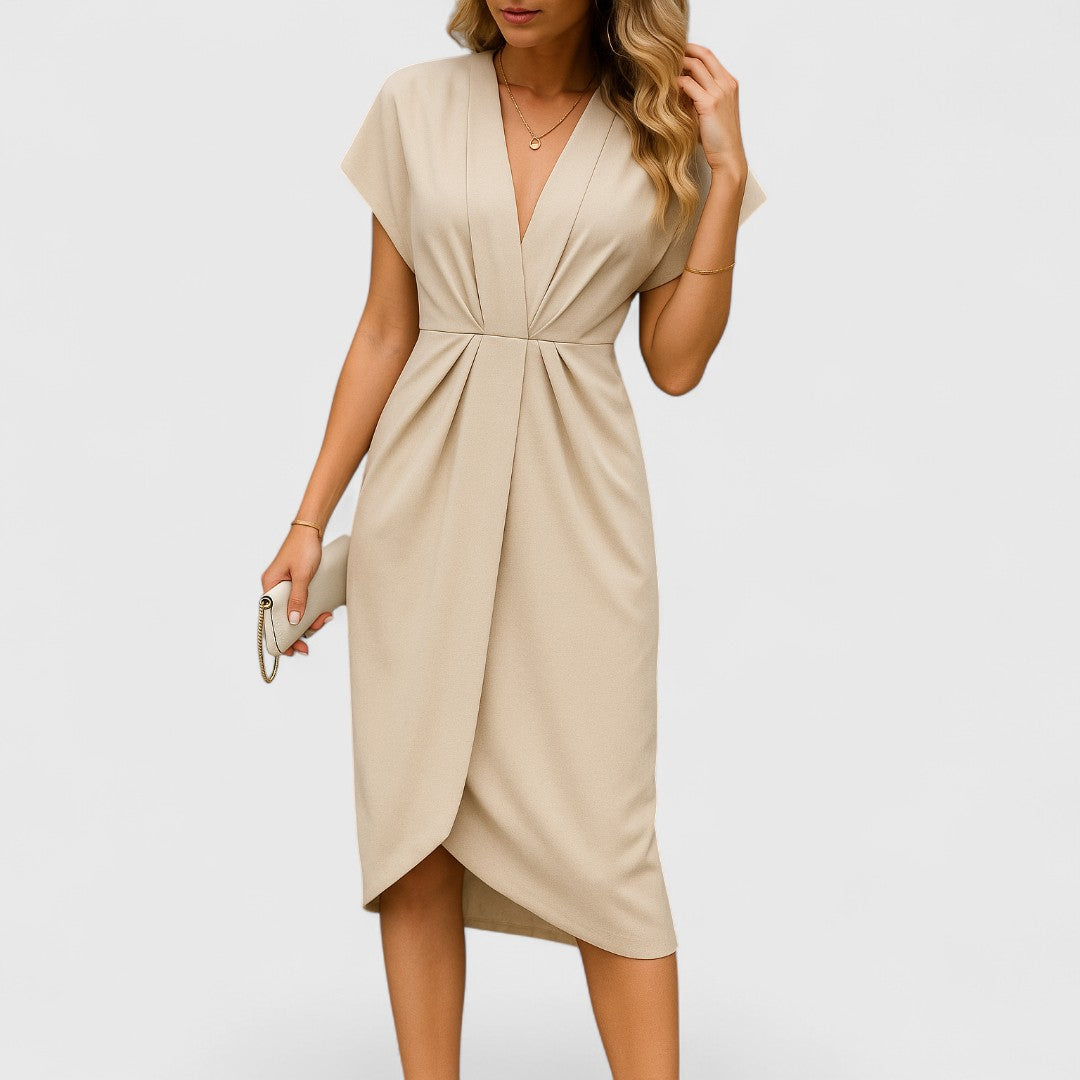This dress delivers a flattering wrap silhouette and a soft, flowing fabric that drapes beautifully from morning to evening.