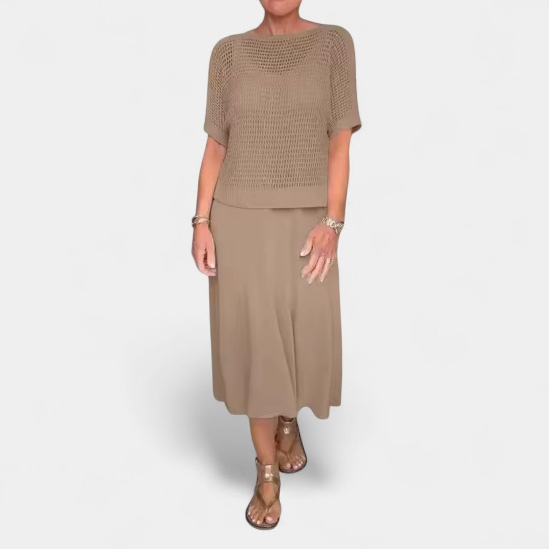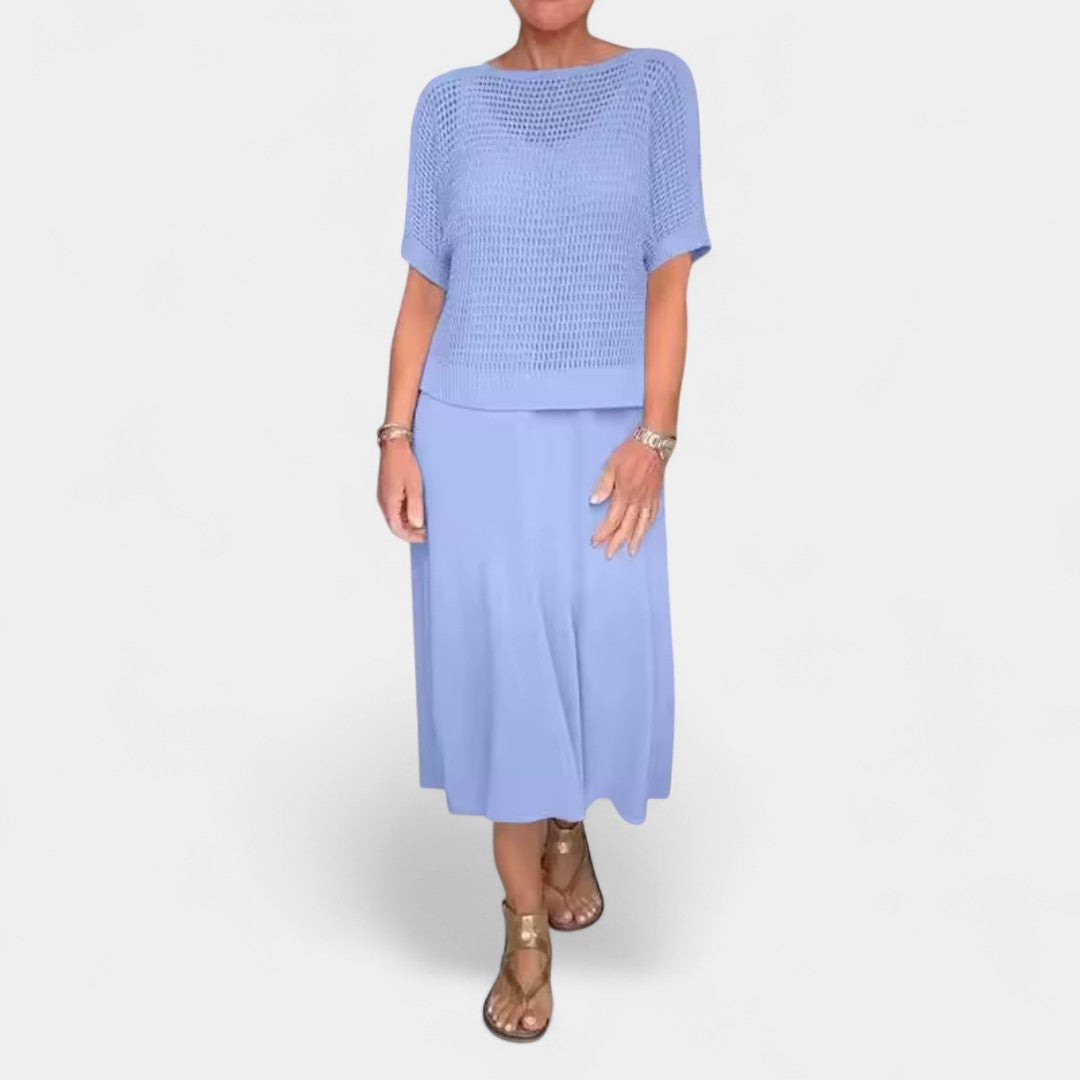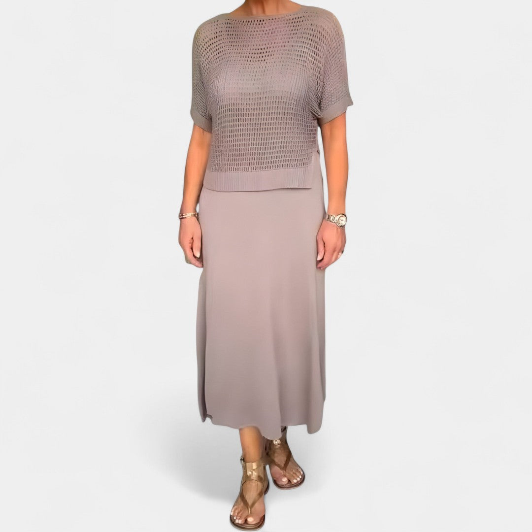 Designed to keep you cool while looking effortlessly polished, it fuses a sculpted knitted bodice with a breezy, floaty skirt for all-day comfort.